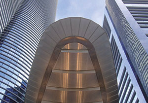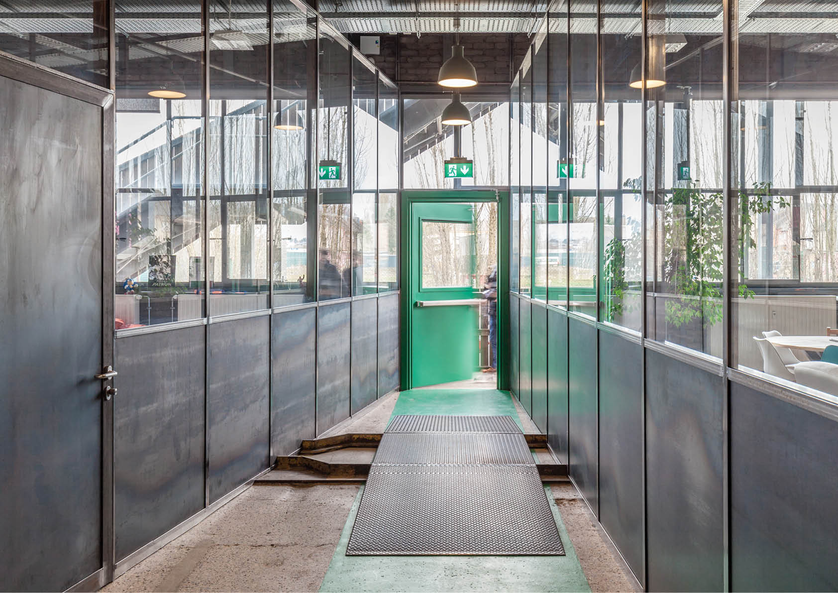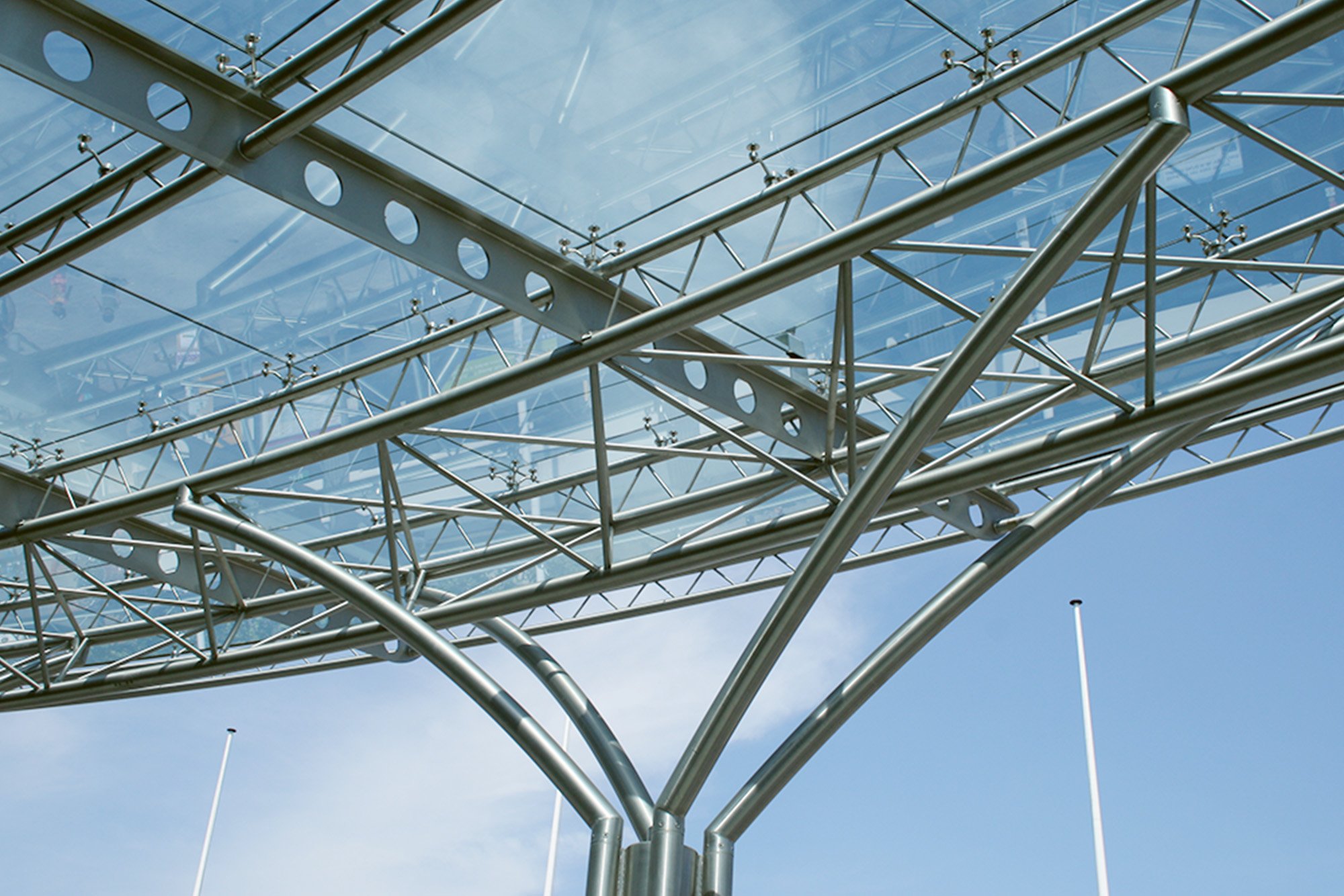 Zeven stalen luifels overdekt met gelijmd glas