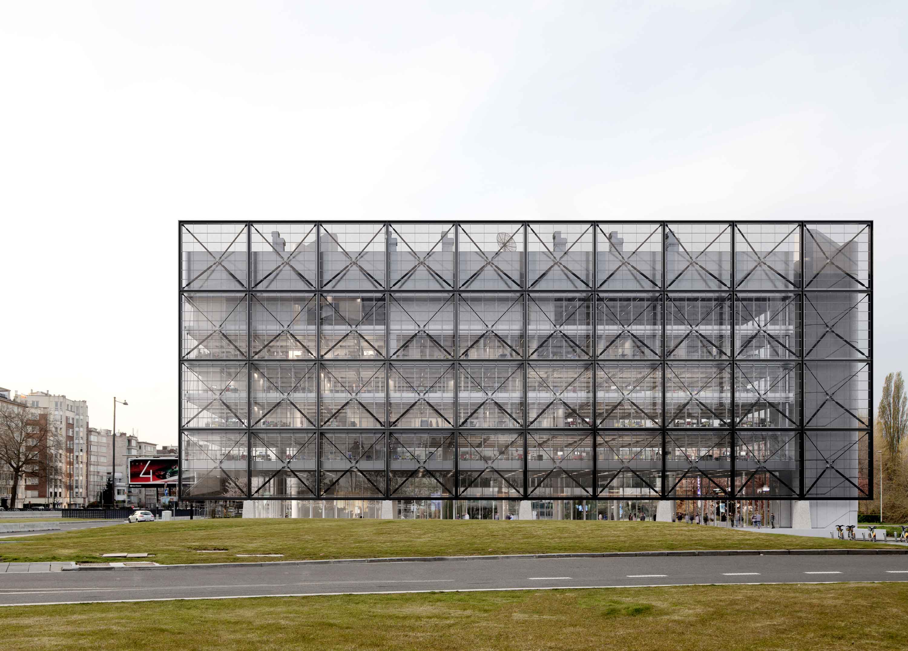 Een volledig glazen omhulsel geeft een glimp van de volledige structuur van het gebouw en creëert maximale transparantie en openheid naar de stad en mediapark.brussels, waarvoor het als showcase dient.