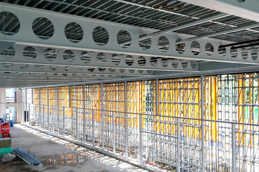 De multifunctionele infrastructuur biedt ongeveer 8.000 m² ruimte verdeeld over 7 verdiepingen, met verdiepingen die worden ondersteund door cellenliggers met een overspanning van 15 meter die aan beide kanten worden ondersteund door een stalen exoskelet en externe betonnen kolommen.