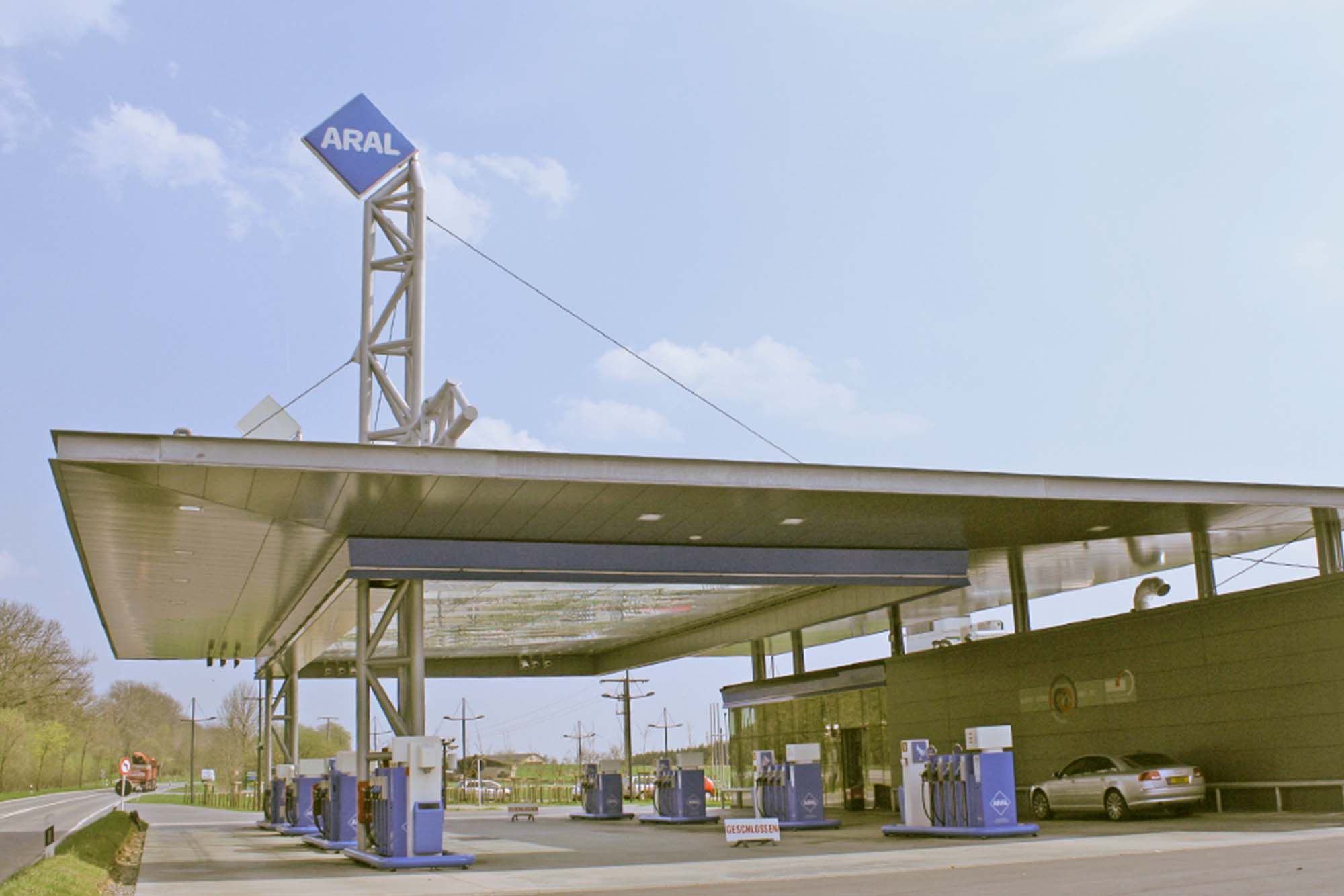Afin de dégager un maximum de surface au sol, l’auvent de Wemperhardt est suspendu à 2 pylônes tridimensionnels reliés par une poutre du même type. La partie centrale est entièrement transparente grâc