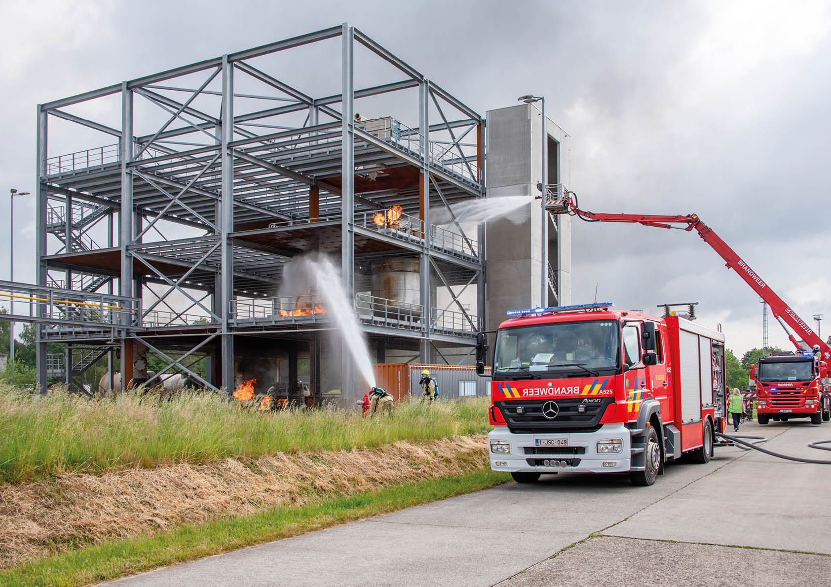 La pièce maîtresse du complexe d’entraînement est le bâtiment de processus ; un cube tridimensionnel flexible en acier de 18 m de haut et une taille de cadre de 7,2 m où un foyer d’incendie peut être mis en scène à divers endroits et étages et pour lequel différents scénarios d’entraînement peuvent être élaborés. Le bâtiment de processus est accessible par 2 escaliers : un noyau en béton résistant au feu et une cage d’escalier ouverte en acier.