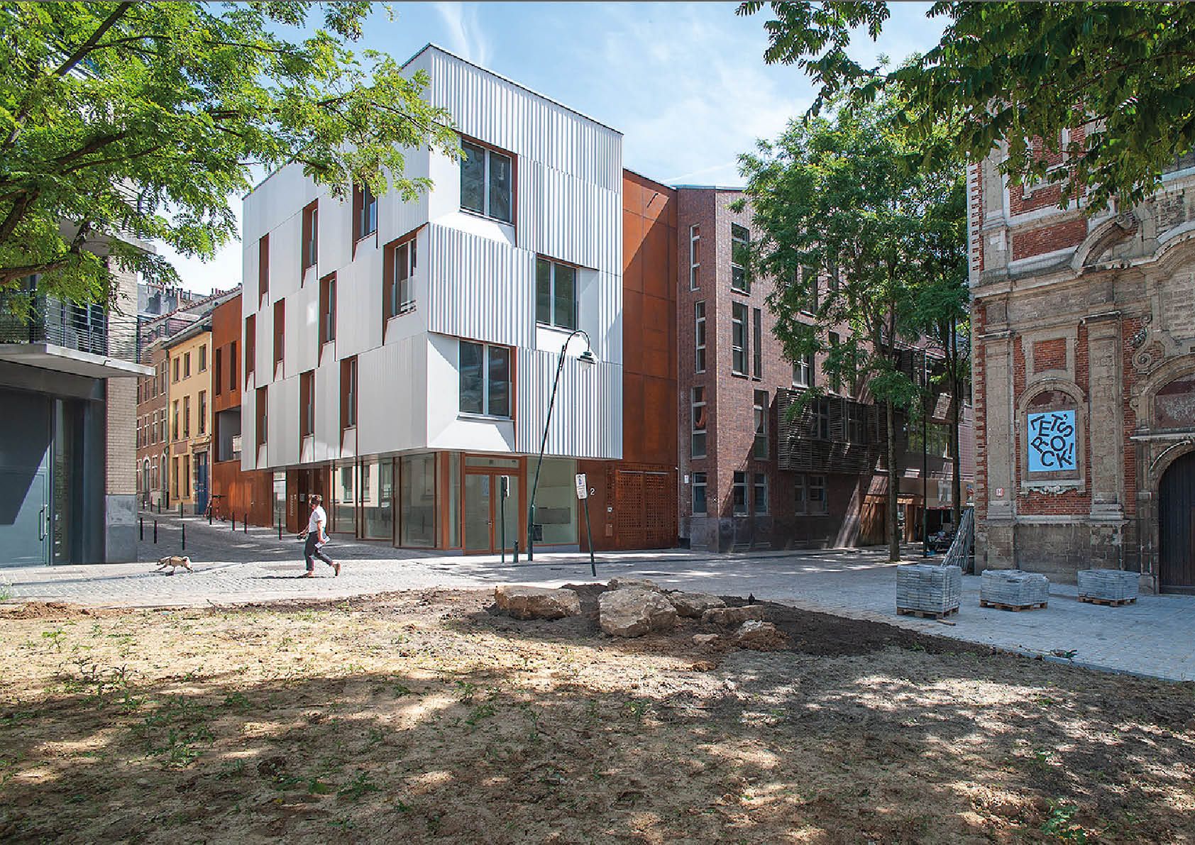 Pour ce bâtiment comprenant une crèche, une salle commune, de 5 logements à finalité sociale et un parking, l’utilisation de plusieurs types d’acier a été privilégié pour des raisons esthétiques et permet une intégration douce au bâti environnant. Ainsi, le bardage en acier corten, d’une surface totale de 286 m2, rappelle la couleur de la terre cuite traditionnelle présente dans les bâtiments du quartier.