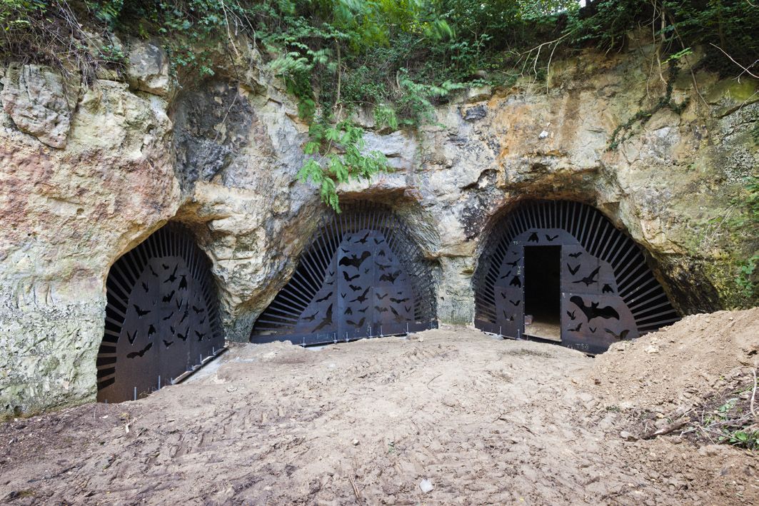 Le Waterkuil, un complexe de grottes marneuses à Vechmaal, est l’un des lieux d’hivernage les plus importants pour les chauves-souris au Limbourg. Depuis 2007, la population diminuait toutefois en raison de visiteurs indésirables qui y cherchaient des fossiles ou organisaient de petites fêtes. L’architecte-concepteur a imaginé des portiques artificiels en acier résistant aux intempéries (« corten ») pour fermer les cinq entrées du Waterkuil. Des silhouettes de chauves-souris servent ici d’accès pour ces animaux.