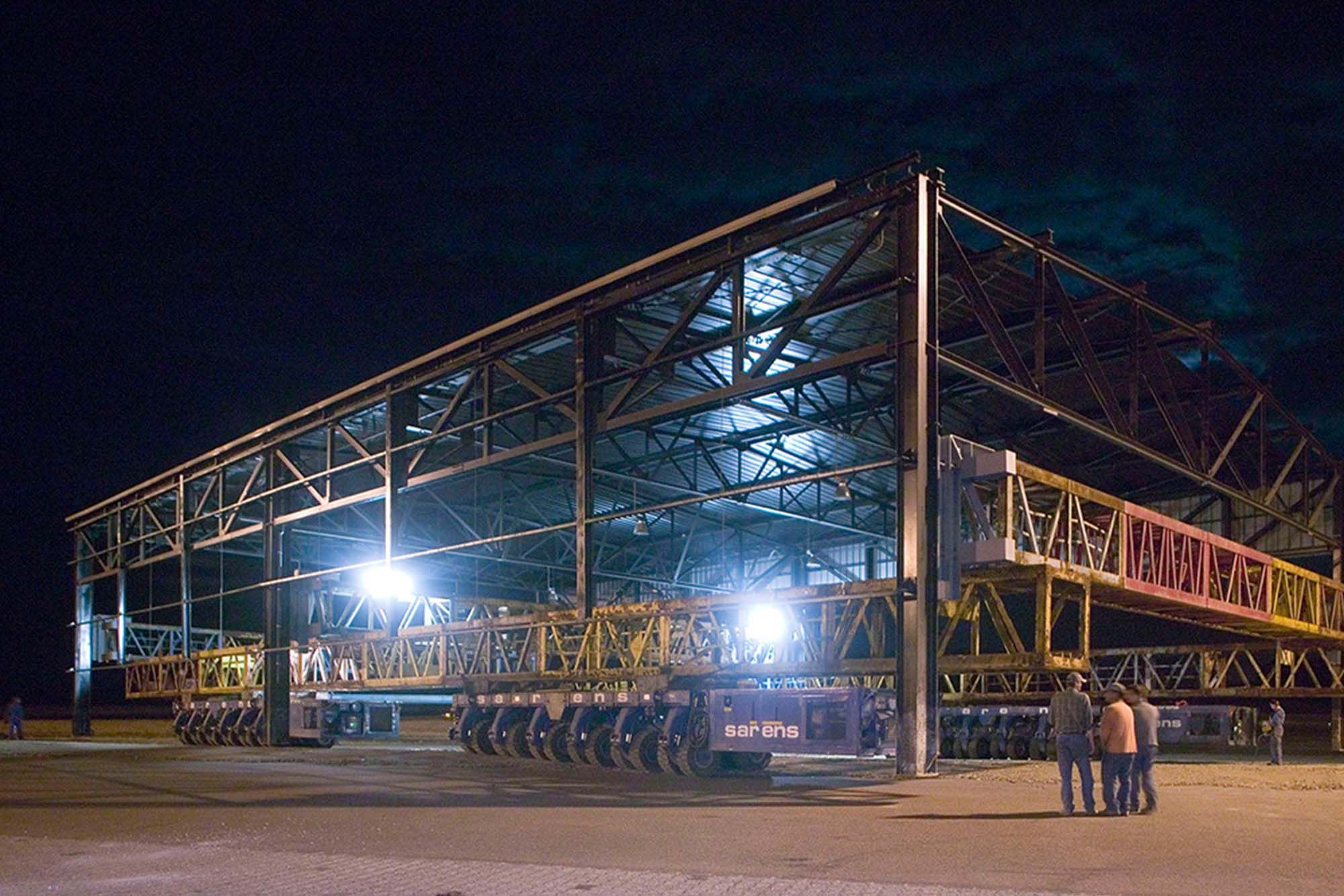 La structure métallique du hall de manutention est du type caissons et fermes treillis reposant sur des colonnes encastrées en pied. Les caissons d’une hauteur et d’une largeur de 3 m composés de profilés HEA 400 et HEA 300 franchissent les portées de 42 m.