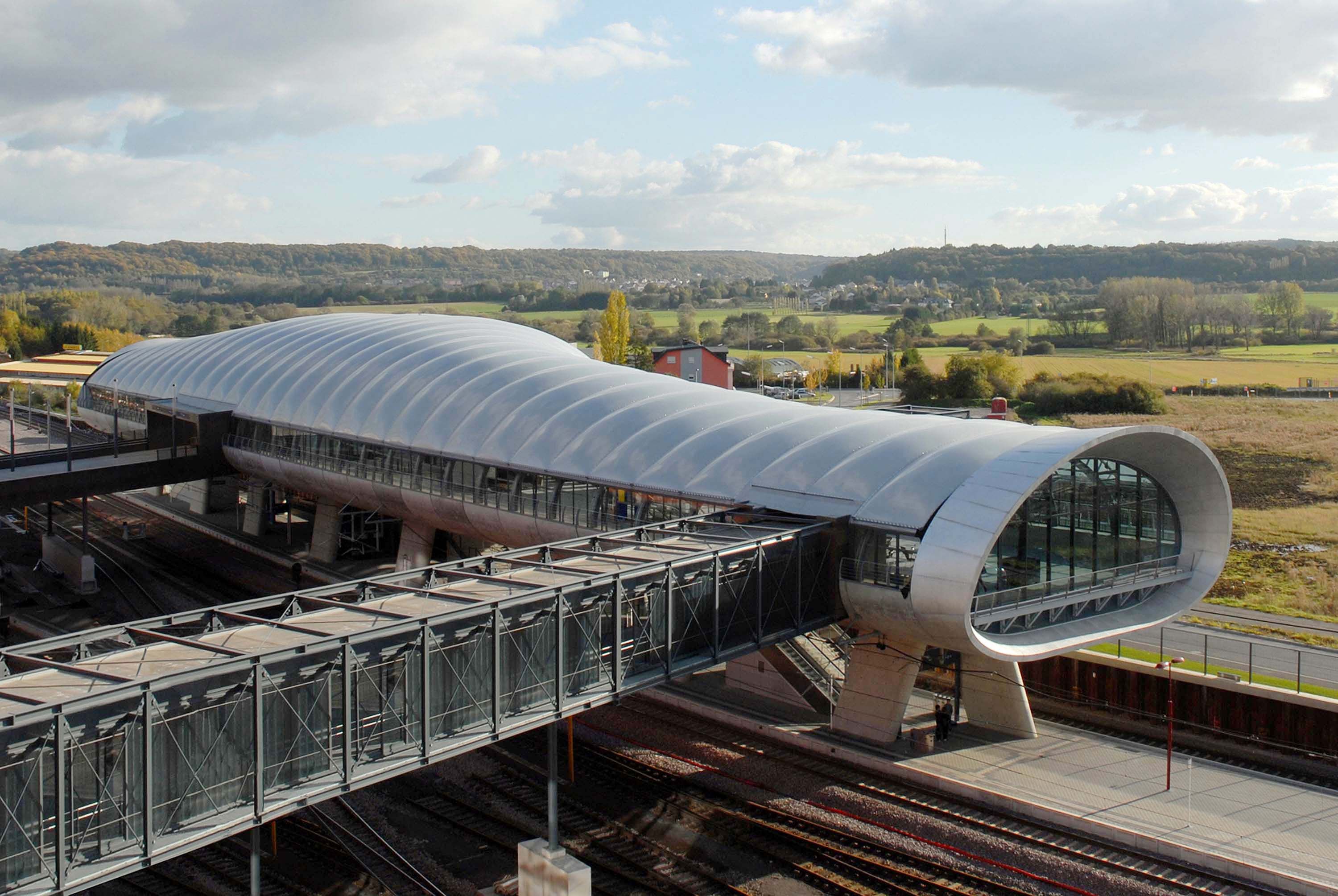 La nouvelle gare du site de Belval représente un lieu important de passage et d’échange. C’est pourquoi, en concevant cette gare, la volonté de l‘architecte a été de mettre l’accent sur les notions de mouvement et de dynamisme. Il a voulu rompre avec l’aspect droit, carré, de la plupart des édifices ferroviaires. Il a alors dessiné une forme arrondie qui fait penser au fuselage d'un avion, si bien que l’on peut parler véritablement de projet « aérien ». La gare – une plate-forme de 120 mètres de long qui repose sur 16 piliers - passe ainsi au-dessus des quais, ceux-ci étant littéralement "avalés" par la gare qui les surplombe.
