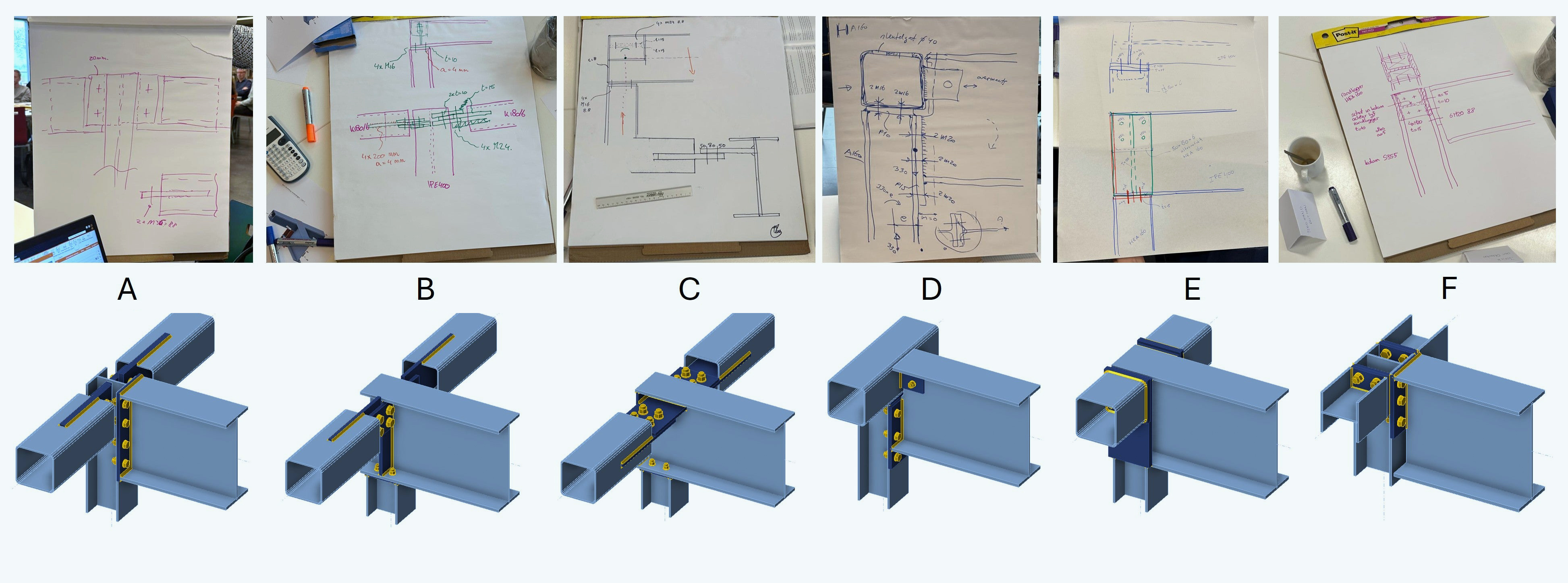 Tijdens deze praktijkgerichte workshop gaan ingenieurs (met een gemengd kennisniveau en gemengde professionele achtergrond) in teams van 4 à 6 personen aan de slag met twee uitdagende verbindingsvraagstukken (focus op gebouwstructuren met standaardprofielen). Elk team start met het bedenken van een oplossing (principe-schets op papier) voor de staalverbinding waarbij rekening gehouden wordt met de structurele prestaties en ook de uitvoerbaarheid.
