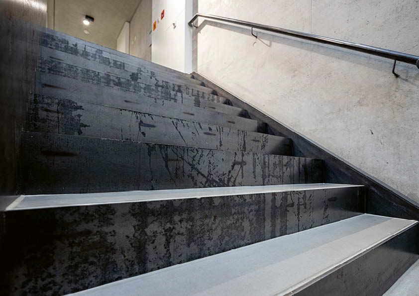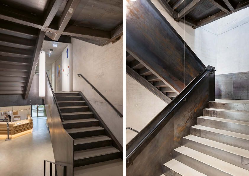 Toen dit ingenieursbureau besliste om zijn eigen kantoorgebouw te realiseren, wilde het een ontwerp dat aansloot bij het imago van de onderneming. Een ruwstalen trap, die als een verticale sculptuur in de lucht hangt, verbindt de verdiepingen met elkaar. Hij bestaat uit een structuur van rechthoekige buizen en stalen platen. In totaal is er 7,5 ton S235-staal verwerkt in deze structuur. De treden zijn zelfdragend van verdieping tot verdieping, met extra steunpunten bij de tussenbordessen. Het gaat om een volledig gelaste constructie. De treden en bordessen zijn bekleed met een gladde dekvloer. Deze laatste is gegoten over akoestische isolatie in een bak, die gevormd werd door de geplooide platen. Alle onderdelen van de trap bestaan uit onbehandeld ruwstaal, dat bijgevolg sporen van machinale bewerking en fabricage vertoont. Ook de roestsporen die na de montage zijn ontstaan, blijven zichtbaar en geven de trap een uniek patina.