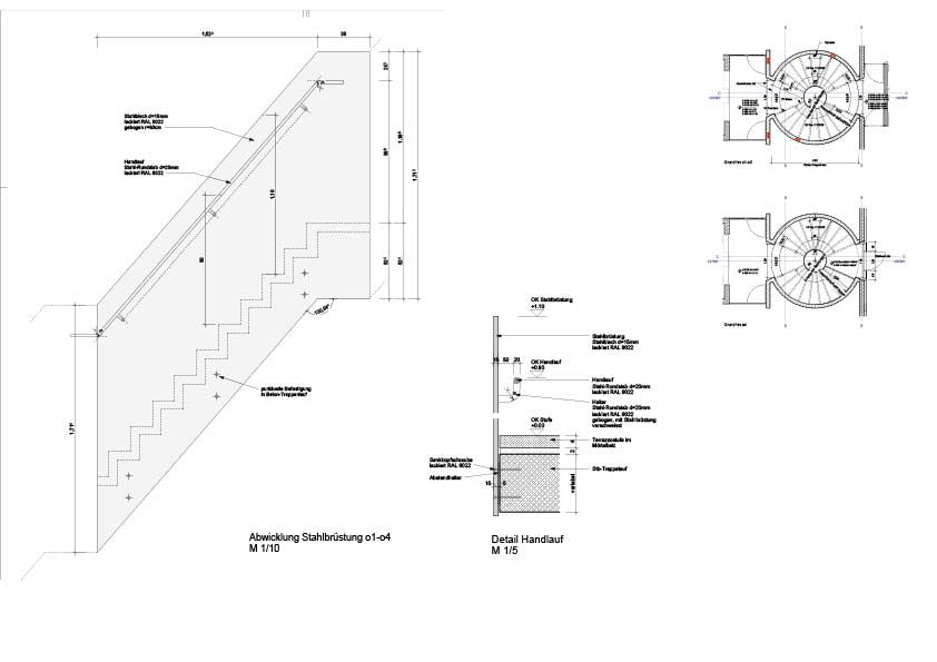 In een nieuw kantoorgebouw van vijf verdiepingen in Luxemburg-Kirchberg pronkt een sculpturale trap met een vloeiende spiraalvorm, in een zachte donkere kleur, met lichte terrazzotreden en verlicht door een verticaal geplaatste ronde koepel. De leuning van deze wenteltrap, die tevens dienstdoet als noodtrap, bestaat integraal uit staal. De treden zijn ter plaatse gerealiseerd in gewapend beton. Er werd een sjabloon getekend op flexibele houten platen, waarna de leuning in verschillende delen werd vervaardigd uit 15 mm dik plaatstaal en in het atelier op maat gebogen werd. Vervolgens is ze naar de werf getransporteerd en onzichtbaar tegen de betonnen treden bevestigd. Tot slot zijn de afzonderlijke delen ter plaatse gemonteerd, geschuurd en gelakt (RAL 8022). De algemene en indirecte verlichting van de trap, die ook fungeert als noodverlichting, wordt verzorgd door een ledstrook die geïntegreerd is in de leuning met een diameter van 20 mm.