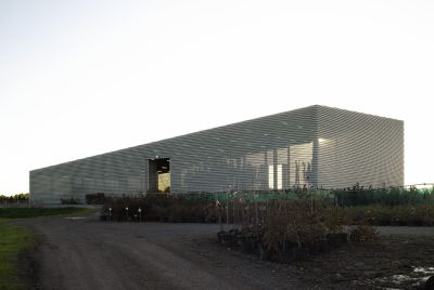 Tekst: De voornaamste functie van dit industriële gebouw voor een plant- en boomkwekerij, is het droog houden van de planten voor ze verplaatst worden. Dit vereist enkel een luchtstroom en beschutting tegen de regen. Het gebouw is bijgevolg ontworpen als een geperforeerd omhulsel met een gesloten dak. De eenvoudige structuur bestaat uit geschilderde gelamelleerde houten spanten, en stalen kolommen - kokerprofielen van 40 bij 40 cm - waarop de stalen dubbelzijdig voorgelakte en geperforeerde gevelbekleding is bevestigd.