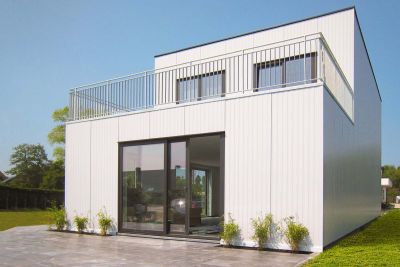 Tekst: A partir de la dalle de sol, une structure en acier a été montée avec des profils sigma. Tant la structure de la toiture que l’étage intermédiaire sont constitués d’un steeldeck (hourdis profilés). Le revêtement de la structure en acier est composé de panneaux sandwich Joris Ide avec isolation PIR. Le panneau extérieur est en acier prélaqué (Colorcoat HPS200 Ultra® - couleur Albatross). Un élément unique de cette habitation réside dans l’intégration des fenêtres dans les panneaux par le biais du concept de la « window integration ».