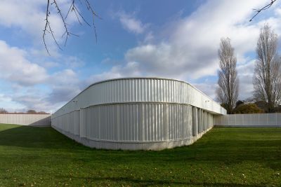 Tekst: Een gebouw met een ietwat eigenzinnig ontwerp, waar heel wat studie- en tekenwerk aan voorafging. Efficiëntie en een slank ontwerp gaan hier hand in hand. De vrije overspanning van 30 m met een structuur aan de buitenzijde en de weinige kolommen binnenin zorgen voor een optimale benutting van het volume. In plaats van een dure paalfundering toe te passen, zijn de gevels uitgevoerd als een stevig vakwerk. De geïsoleerde wandpanelen zijn van Joris Ide (JI WALL 1000 VB 80 met Colorcoat HPS200 Ultra®).