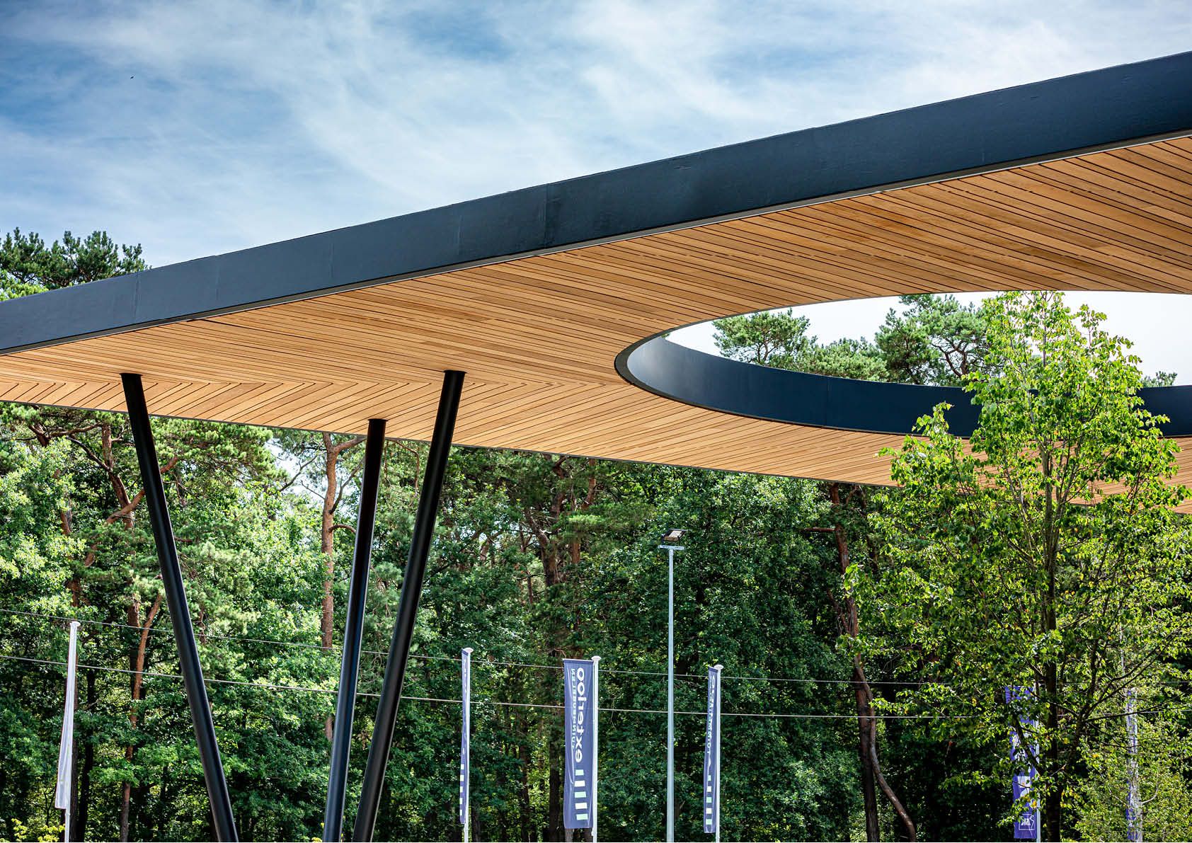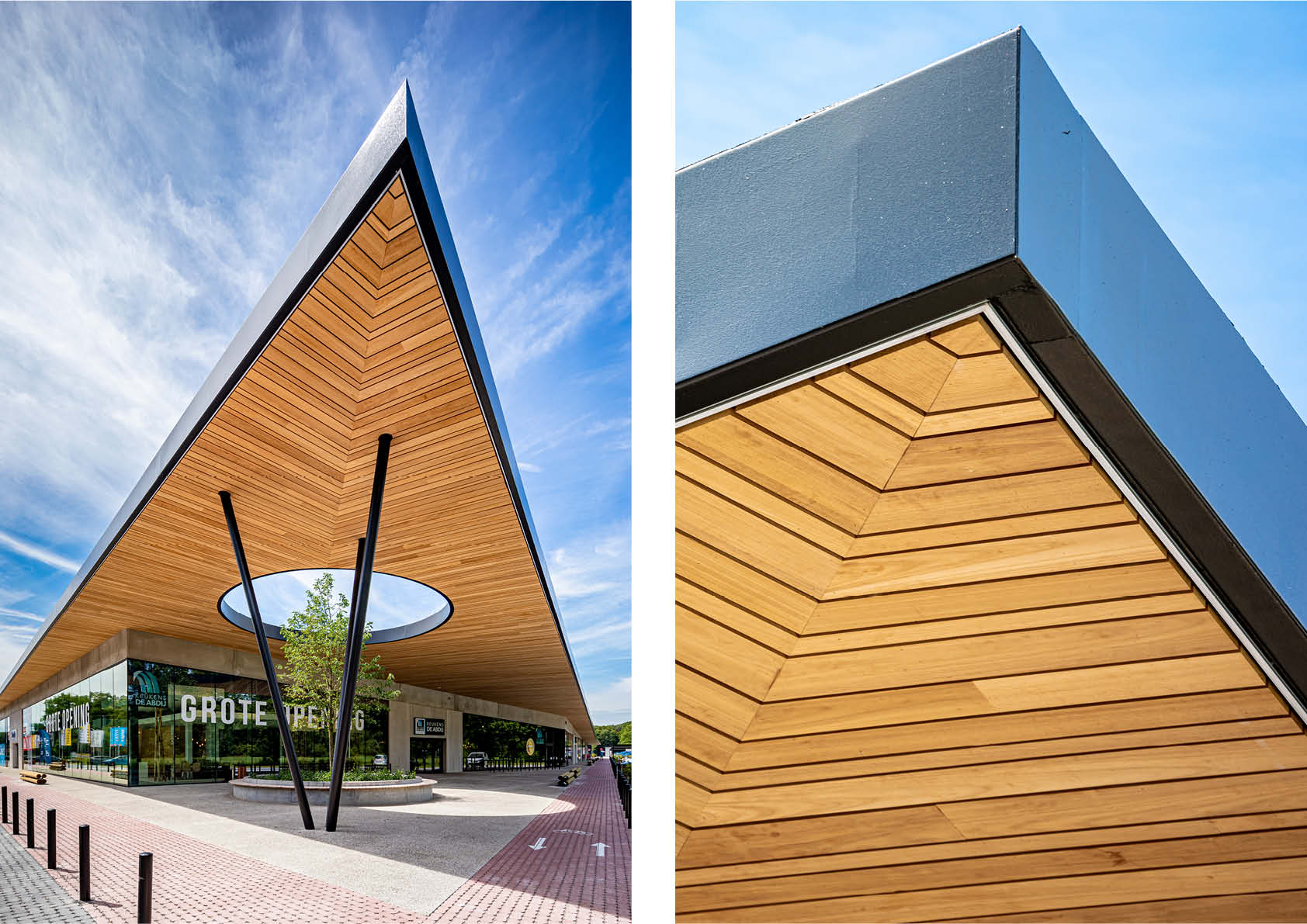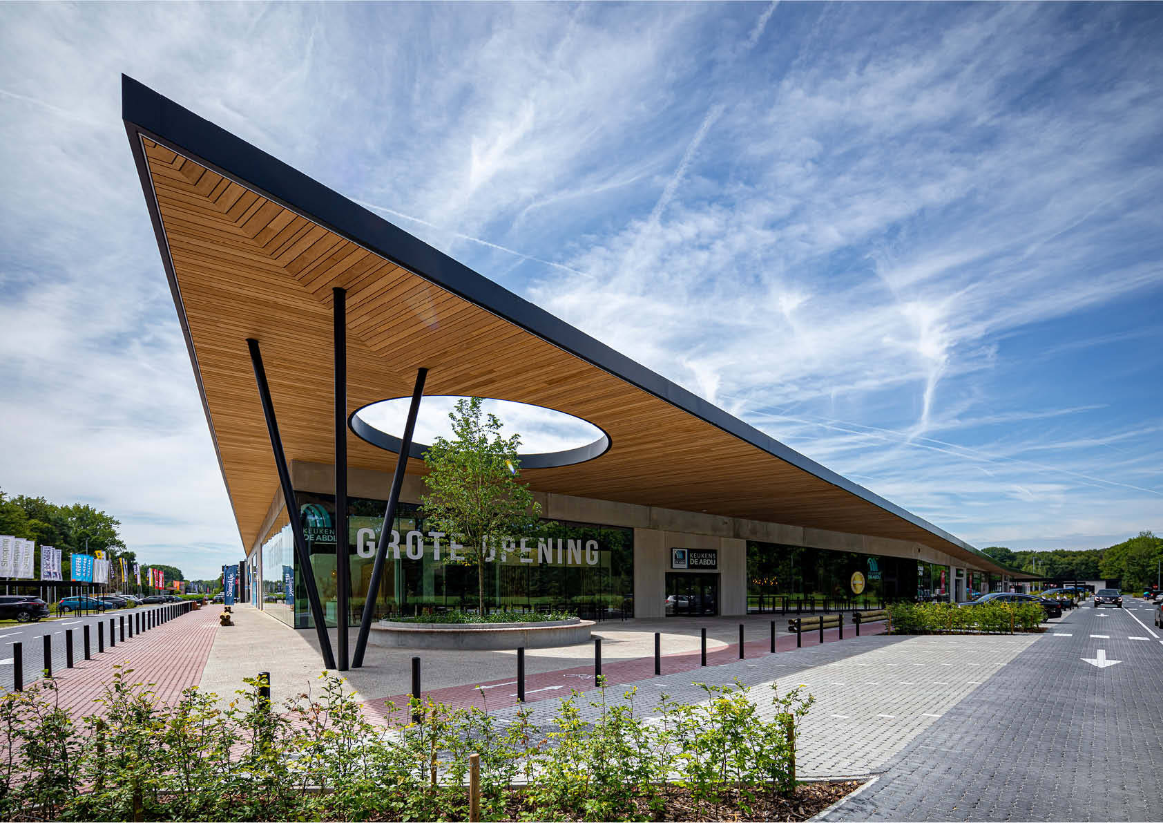 De voormalige site van een meubelbedrijf in Zoersel werd omgetoverd tot een retailpark met acht winkels. Om het evenwicht tussen bebouwde en natuurlijke omgeving te behouden, werd gekozen voor een eyecatcher in de vorm van een indrukwekkende stalen luifel van 17 meter. In de luifel is een cirkelvormige opening voorzien waarin een boom van acht meter groeit.