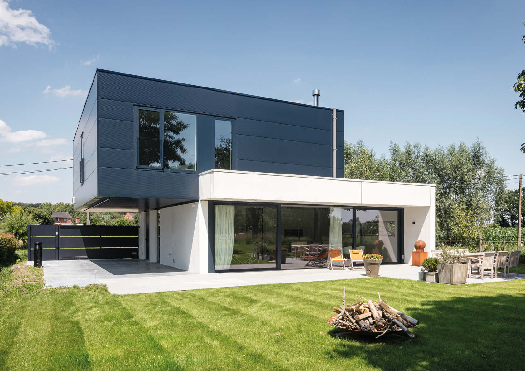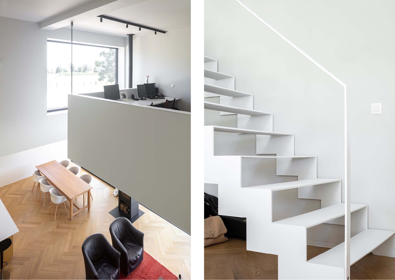 De bouwvorm van deze vrijstaande woning in het Waaslandse groen is met wat verbeelding te omschrijven als twee over elkaar geschoven blokjes, alsof ze samen een duet zingen. Twee rechtgeaarde volumes, twee identiteiten die een beeldende spanning opleveren (beton versus staal). De stalen draagstructuur – gestraald en geschilderd in lasprimer en grondverf – is opgevat als een skelet van warmgewalste profielen (circa 15 ton S235-staal).