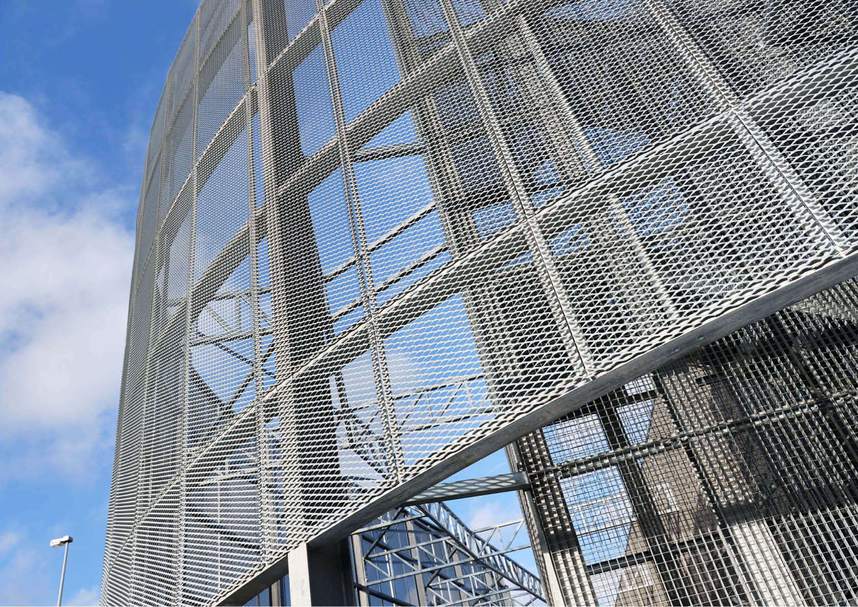 Er werd er geopteerd voor strekmetaal Classico 85 (MDB Metal), inclusief kant-en-klaar gegalvaniseerde modules. Het werd licht glanzend geleverd, maar zal na verloop van tijd een patina ontwikkelen en mat worden. Deze bekleding strekt zich uit over de gehele lengte van de hoofdgevel. Ze gaat door om de hoek op de gevel, gericht naar de Grands Malades-brug - dit is waar het grootste BricoPlanit-uithangbord zich bevindt - en dan weer terug naar de achtergevel, en bestrijkt iets meer dan 2100 m².