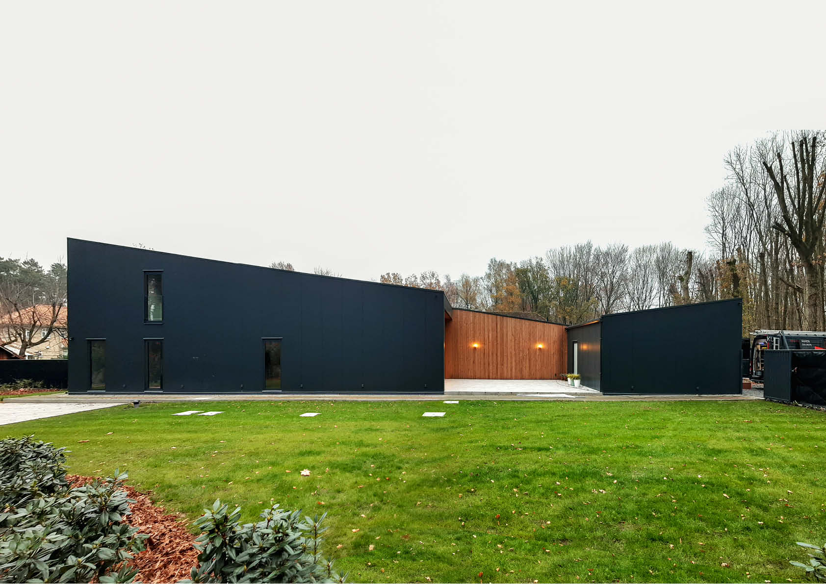 De keuze voor een staalstructuur lag dus voor de hand, ook om de uitvoeringsfase zo kort mogelijk te houden – het volledige bouwproces, van afbraak tot en met interieurafwerking, nam slechts negen maanden in beslag! – en vanwege economische en ecologische redenen (recyclage). Zowel de wanden als het dak zijn integraal bekleed met antracietgrijze industriële sandwichpanelen. De onderkant van de dakoversteken boven de beglaasde kopgevel, die oververhitting vermijden, en de wanden die aansluiten op de terrassen zijn dan weer afgewerkt met hout. Dit zorgt voor een fraai visueel contrast.